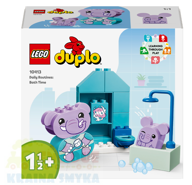 Pomóż dzieciom w wieku od 18 miesięcy zrozumieć ich emocje dzięki zabawie zestawem Moje pierwsze codzienne czynności — kąpiel (10413). Zawiera on dwie figurki słoni — rodzica i dziecka — a także wannę, prysznic i toaletę. Rodzice i przedszkolaki dołączą do nowych przyjaciół LEGO® DUPLO® w łazience, aby bawić się w mycie słonika i uczyć się dbania o higienę.
